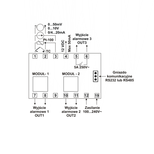 Wyjścia opcjonalne (dwa moduły rozszerzające): | wyjście przekaźnikowe SPST 3A 250V, trwałość 105 cykli wyjście SSR 18V= 20mA analogowe 0/4...20mA; 0...10V do retransmisji |