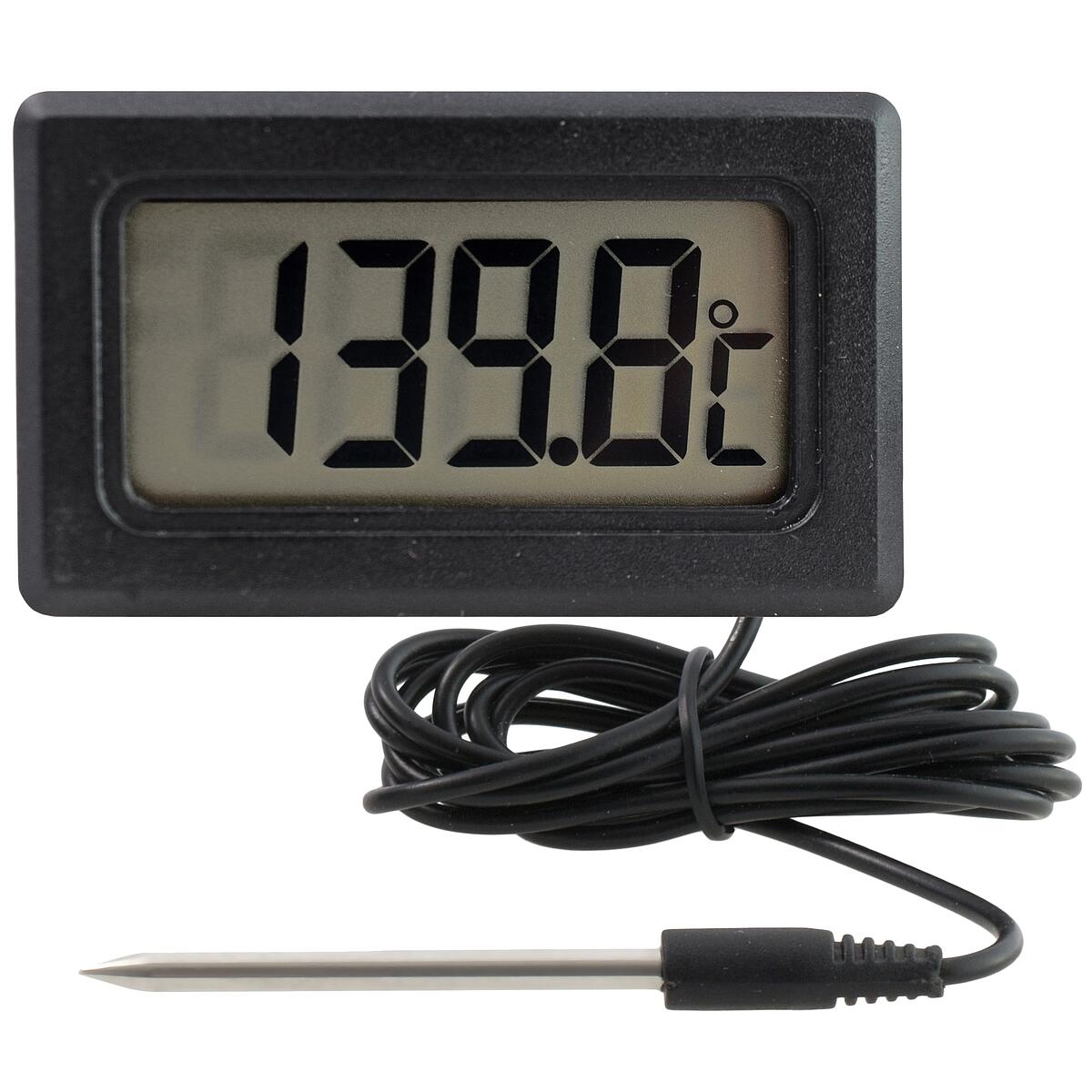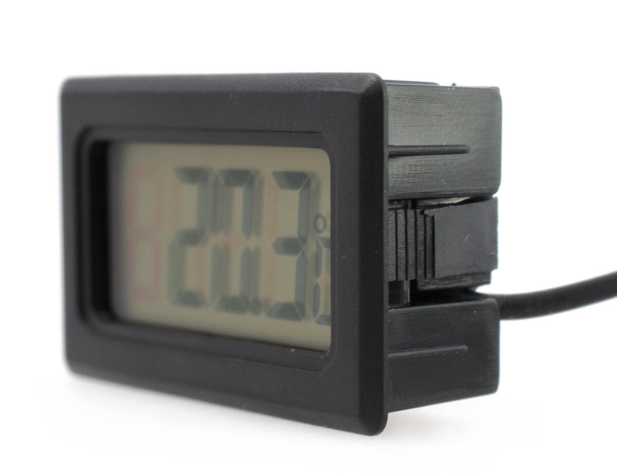 Termometry elektroniczne z wyświetlaczem LCD. Zasilane z jednej baterii. Zaopatrzone są w zintegrowany czujnik temperatury NTC o długości 1,5m. Montowane w tablicy na zatrzask.
