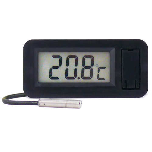 Termometry elektroniczne z wyświetlaczem LCD. Zasilane z jednej baterii z wygodną wymianą od frontu. Zaopatrzone są w zintegrowany czujnik temperatury NTC o długości 1,5m. Montowane w tablicy na zatrzask.