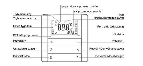 Tryb pracy: | manualny: utrzymuje jedną temperaturę automatyczny: utrzymuje poziom temperatury komfortowy lub ekonomiczny wg. zadanego programu przeciwzamrożeniowy: zabezpieczenie przed spadkiem temperatury poniżej ustawionej wartości |