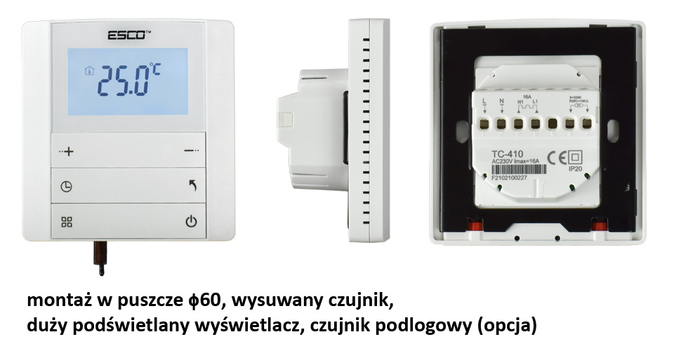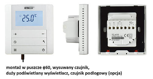 Jest to urządzenie niewielkich rozmiarów 86x90x26mm (szerokość xwysokość x głębokość). W związku z tym ten termostat nie będzie na co dzień wyróżniać się i zaburzać zaprojektowanego wystroju wnętrza. Termostat TC410 posiada podświetlany wyświetlacz, co zwłaszcza w nocy może okazać się bardzo użyteczną funkcją.