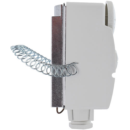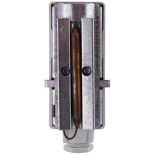 Przylgowy termostat z termoelementem cieczowym. Ciepło przekazywane jest do termostatu za pomocą tylnej, metalowej ścianki. Realizuje pomiar czynnika w rurze. Mocowany na rurach o średnicy w zakresie od 2/3 do 4 cala za pomocą dołączonej sprężyny. Wyposażony w styki typu SPDT. Posiada uszczelnioną obudowę zabezpieczającą przed wpływem podwyższonej wilgotności. Przeznaczony jest do sterowania w instalacjach grzewczych, szczególnie przydatny do automatycznej regulacji bojlerów, sterowania pompami itp.