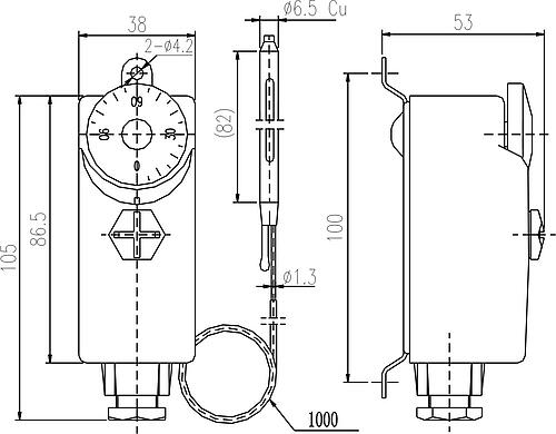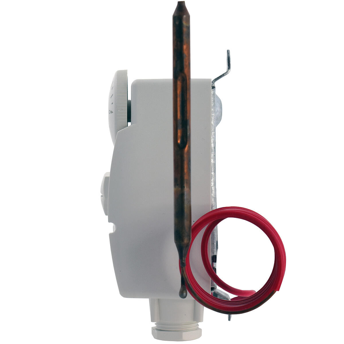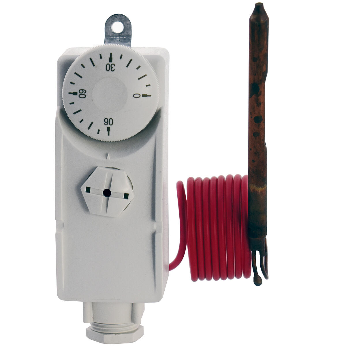 Termostat z oddaloną głowicą pomiarową z termoelementem cieczowym. Wyposażony w styki typu SPDT (pracuje na grzanie lub chłodzenie). Przeznaczony jest do sterowania w instalacjach c.o. Montaż termostatu naścienny, zaś głowicy pomiarowej zanurzeniowy (woda, powietrze) lub przy pomocy opaski przylgowy.