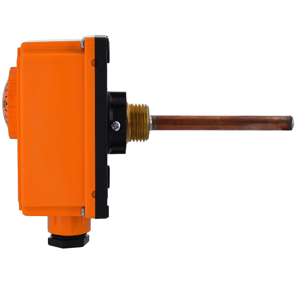 Zanurzeniowy termostat z termoelementem cieczowym (zasada pomiaru wykorzystująca rozszerzalność materiałów). Wyposażony w styki typu SPDT (pracuje na grzanie lub chłodzenie). Przeznaczony jest do sterowania w instalacjach grzewczych, szczególnie przydatny do automatycznej regulacji bojlerów, sterowania pompami itp. Montaż za pomocą przyłącza gwintowanego G1/2".