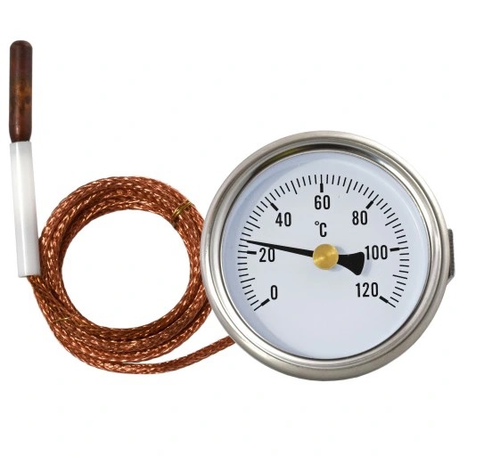 Termometr tarczowy do pomiaru temperatury cieczy, gazów i ciał stałych. Pomiar temperatury dokonywany jest przez głowicę pomiarową na końcu rurki kapilarnej. Zasada pomiaru opiera się na wykorzystaniu zjawiska rozszerzalności cieczy umieszczonej w rurce kapilarnej, która pod wpływem zmian temperatury zmienia swoją objętość i powoduje wychylenie wskazówki na tle tarczy termometru z naniesioną podziałką temperatury.