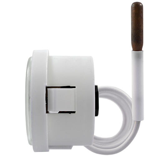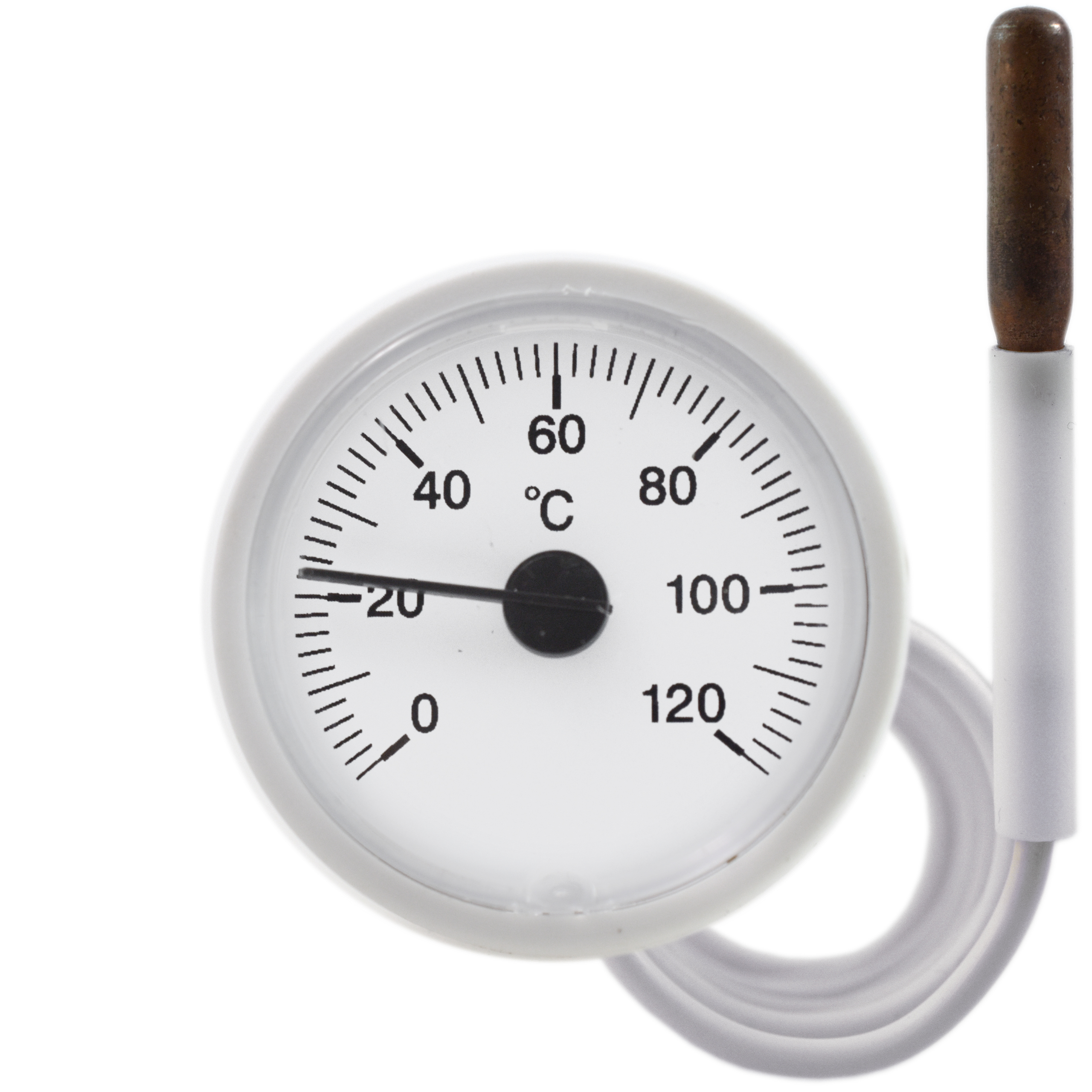 Termometr tarczowy do pomiaru temperatury cieczy, gazów i ciał stałych. Pomiar temperatury dokonywany jest przez głowicę pomiarową na końcu rurki kapilarnej.