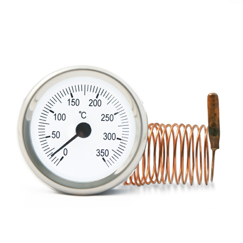 Termometr tarczowy do pomiaru temperatury cieczy, gazów i ciał stałych. Pomiar temperatury dokonywany jest przez głowicę pomiarową na końcu rurki kapilarnej.