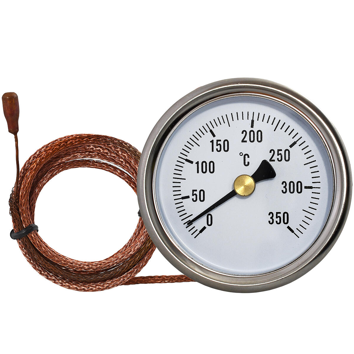 Termometr tarczowy do pomiaru temperatury cieczy, gazów i ciał stałych. Pomiar temperatury dokonywany jest przez głowicę pomiarową na końcu rurki kapilarnej. Zasada pomiaru opiera się na wykorzystaniu zjawiska rozszerzalności cieczy umieszczonej w rurce kapilarnej, która pod wpływem zmian temperatury zmienia swoją objętość i powoduje wychylenie wskazówki na tle tarczy termometru z naniesioną podziałką temperatury.